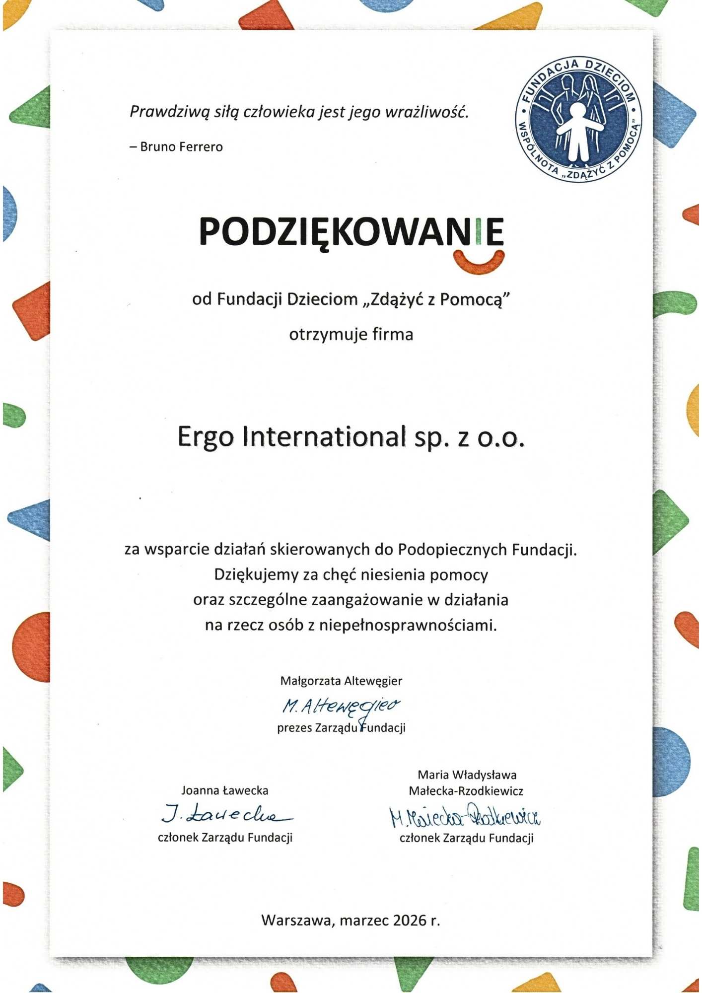 W marcu 2026 roku firma ERGO International sp. z o.o. otrzymała oficjalne podziękowanie od Fundacji za chęć niesienia pomocy oraz szczególne zaangażowanie w działania na rzecz osób potrzebujących wsparcia. To wyróżnienie stanowi dla nas nie tylko powód do dumy, ale także motywację do dalszego działania na rzecz społeczności.