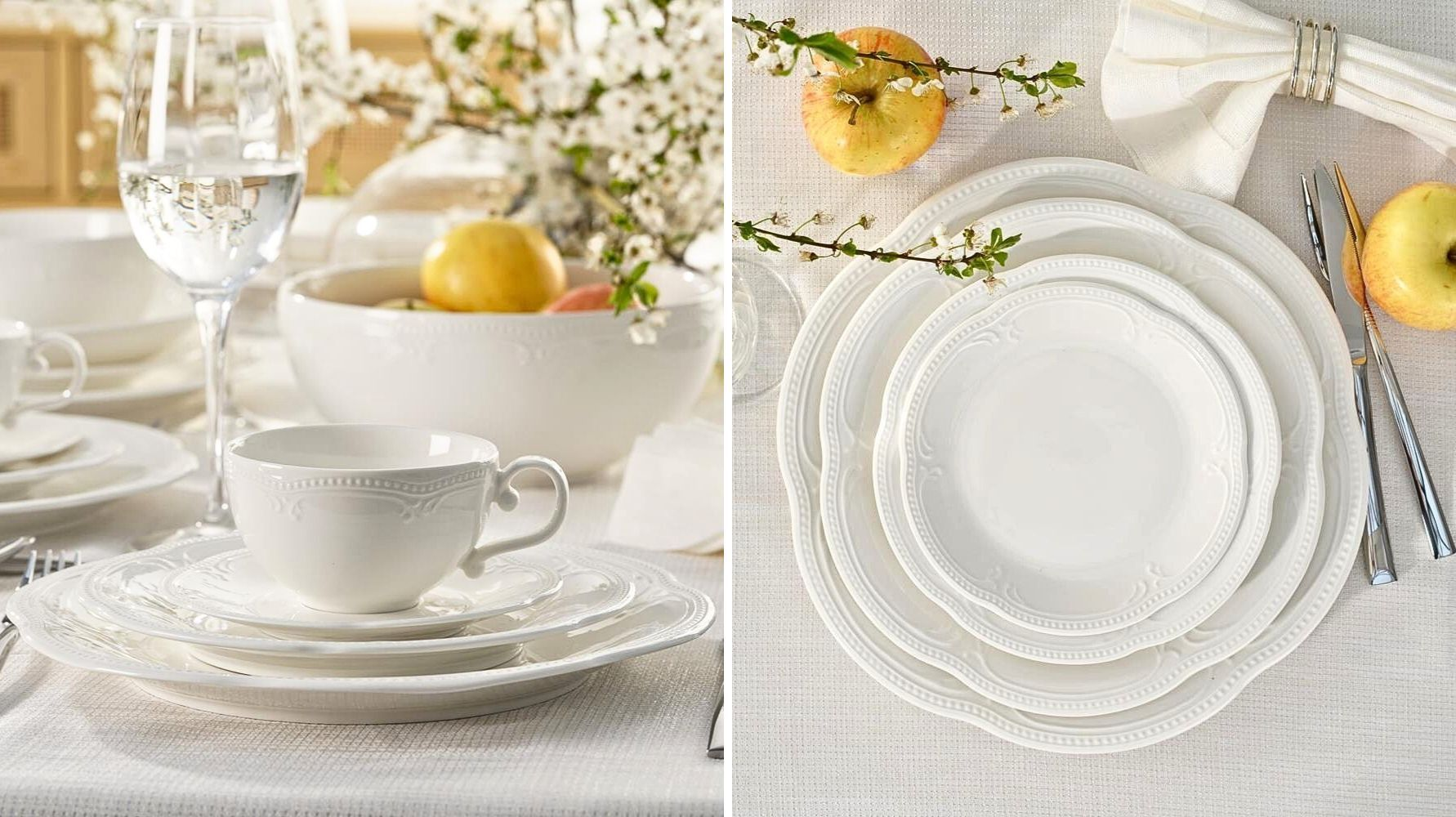 Zastawę cechuje klasyczne wzornictwo pełne subtelnej elegancji. Naczynia z porcelany w mlecznym odcieniu bieli zdobi delikatny relief. Ich łagodne formy i profilowane obrzeża tworzą harmonijną i stylową kompozycję na stole. Zastawa wykonana jest z porcelany wzmocnionej o wzbogaconym składzie, decydującym o jej trwałości i odporności. Dzięki temu naczynia są odpowiednie do intensywnego użytkowania. Bez obaw można je myć w zmywarce i używać w kuchence mikrofalowej. Kolekcja obejmuje szeroką gamę naczyń oraz serwisy obiadowe i kawowe.