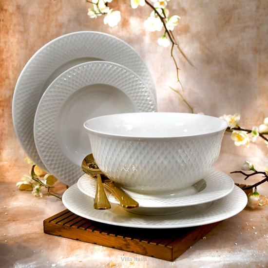 Prosty a równocześnie elegancki zestaw obiadowy na 12 osób z kolekcji ceramiki w śmietankowym odcieniu bieli. Serwis obiadowy i pozostałe elementy kolekcji Eclat wyróżniają się klasyczną formą, która decyduje o ich ponadczasowości. Ciekawym elementem zdobiącym naczynia jest delikatny relief w formie kratki na całej powierzchni naczyń oraz brzegach talerzy i półmisków. Kolekcja jest pełna lekkości i finezji dzięki stylowym stopkom naczyń (salaterki, kubka, filiżanki, czajnika, mlecznika, cukiernicy).