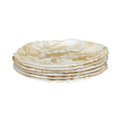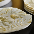 Ręcznie wykonany talerzyk deserowy z wytłaczanym wzorem roślin tropikalnych. Perłowe wykończenie i wzór malowany stonowanym odcieniem złota tworzą niezwykły efekt dekoracyjny. Na uwagę zasługuje nieregularny brzeg talerza nadający mu niepowtarzalny wygląd. Dekoracja naniesiona jest od spodu, dzięki czemu gładką powierzchnię talerzyków łatwo jest utrzymać w czystości.