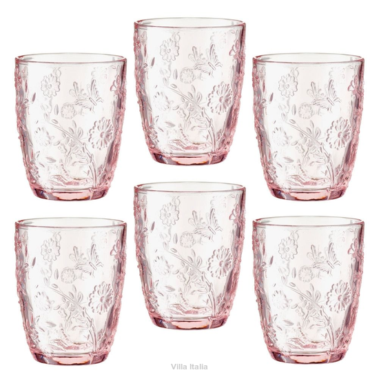Zestaw szklanek do wody i innych zimnych napojów. Różowe szklanki MERIDA zdobione są tłoczonym wzorem kwiatowym. Szklanki te wykonane są z dość grubego, wysokiej jakości szkła barwionego w masie, co decyduje o ich estetycznym wyglądzie i trwałości koloru. Wypukły wzór sprawia, że szklanki mienią się pod wpływem oświetlenia lub w słońcu, wspaniale prezentując się na stole. Ich różowy kolor urozmaici białe zastawy stołowe i doda uroku nakryciu stołu.